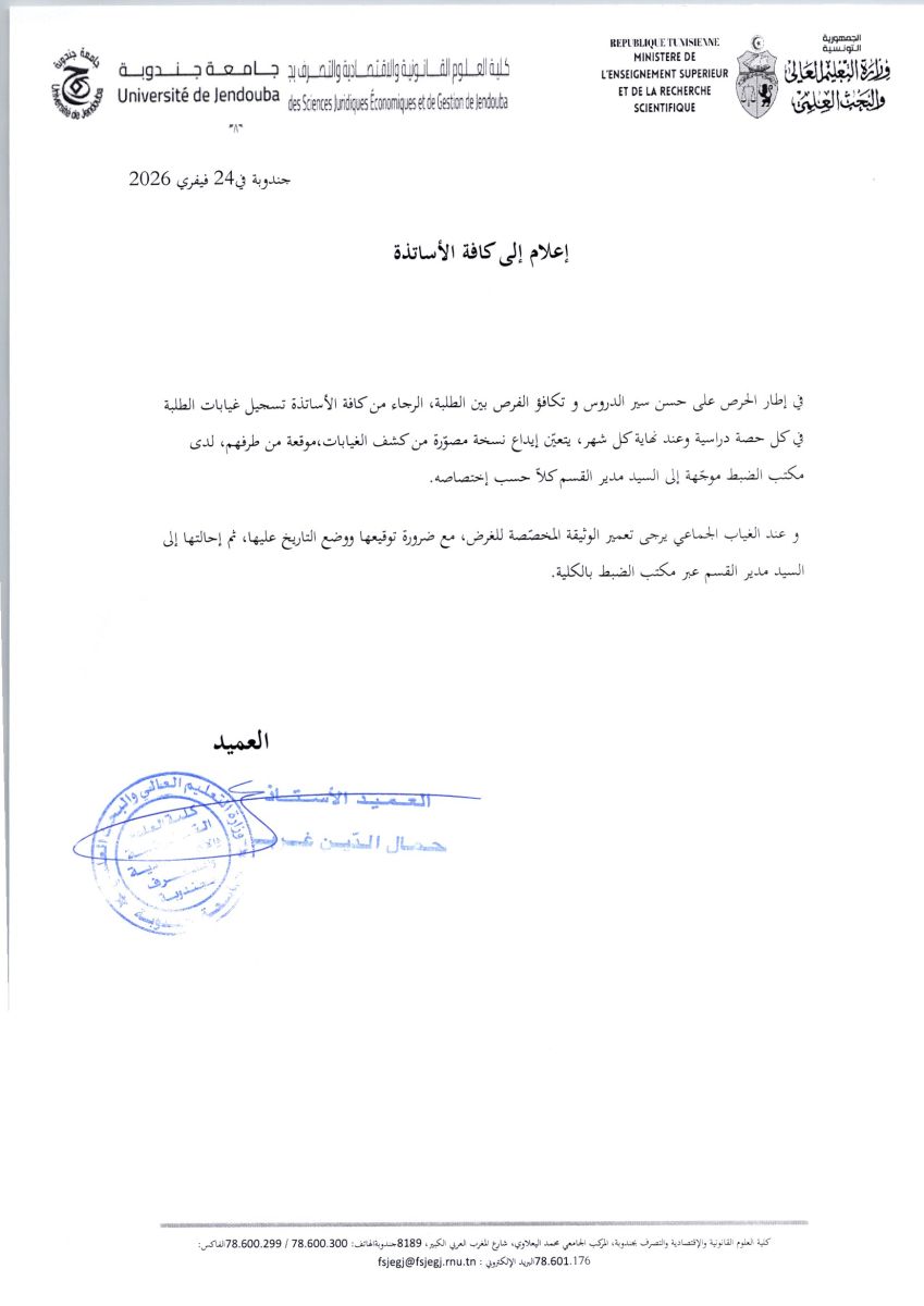 اعلام الى كافة الأساتذة حول تسجيل غيابات الطلبة