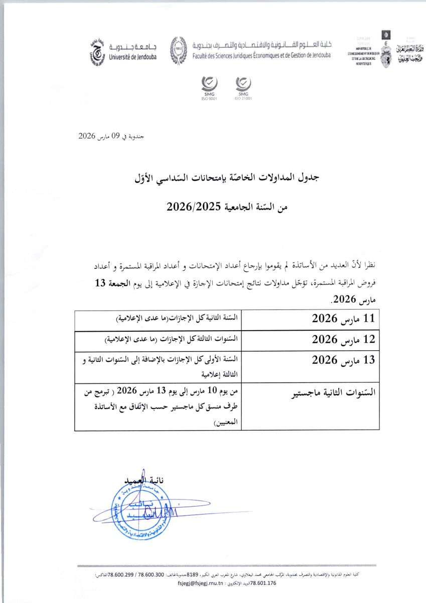 جدول المدولات الخاصة بإمتحانات السداسي الأول من السنة الجامعية 2025/2026