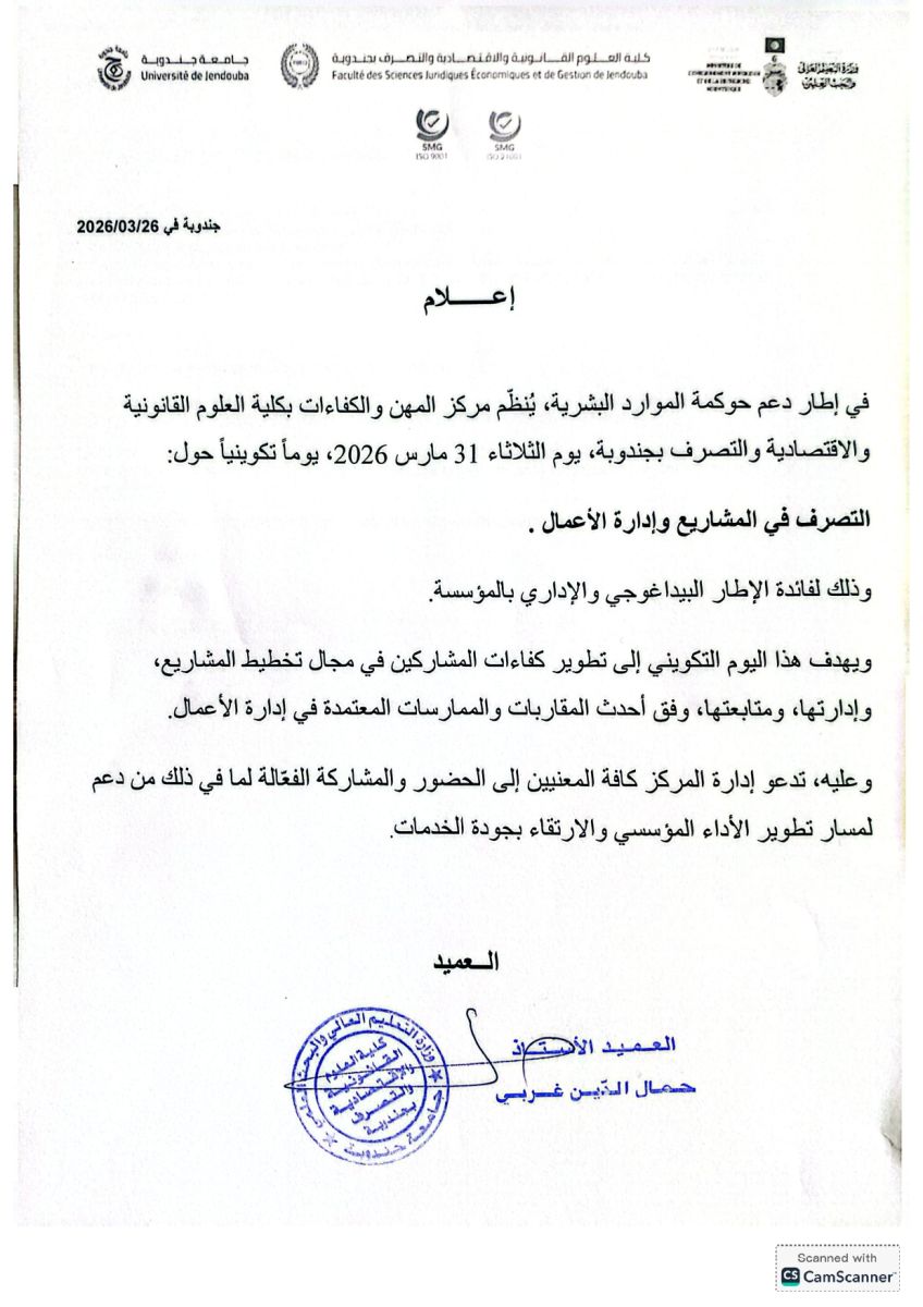 اعلام حول دورة تكوينية في التصرف في المشاريع و ادارة الأعمال لفائدة الإطار البيداغوجي و اللإداري بالمؤسسة