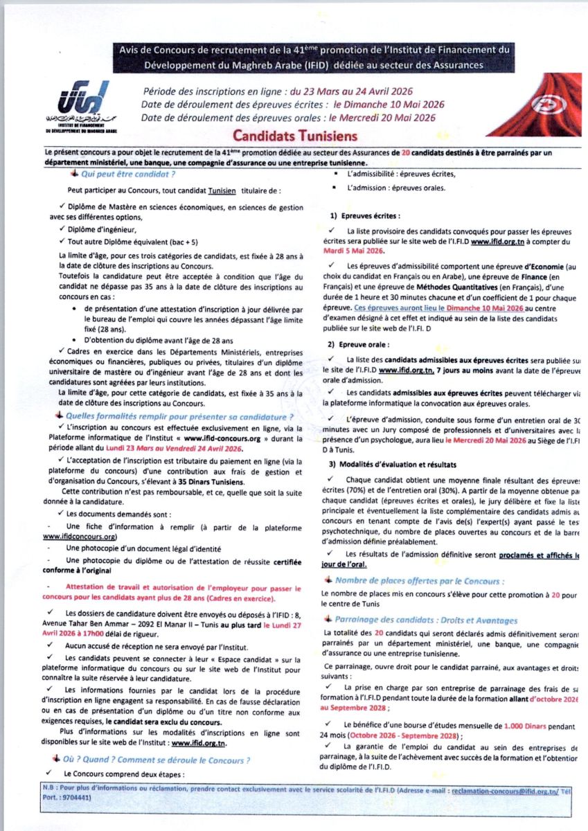Avis de concours de recrutement de la 41 ème promotion de l'Institut de Financement du Développement du Maghreb Arabe (IFID) dédiée au secteur des Assurance