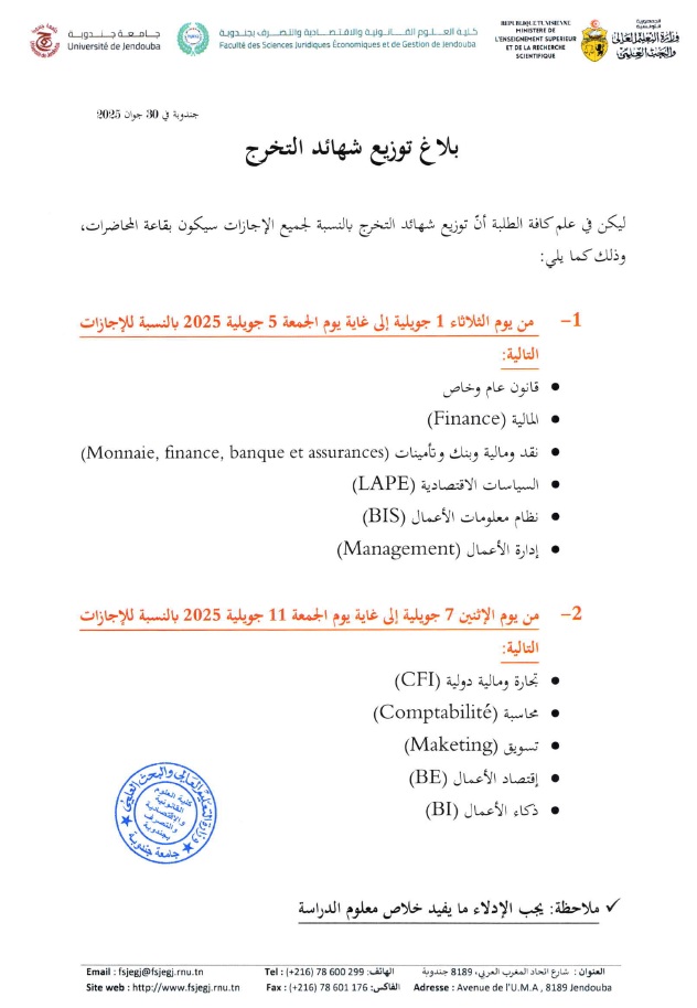 بلاغ توزيع شهائد التخرج