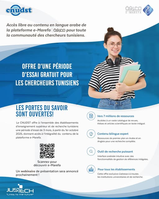 Chercheurs tunisiens, vos horizons s’élargissent ! Profitez de 3 mois d’accès gratuit à la plateforme e-Marefa : plus de 7 millions de ressources scientifiques en arabe et en anglais : https://cnudst.rnrt.tn/explorez-e-marefa-nouvelle.../