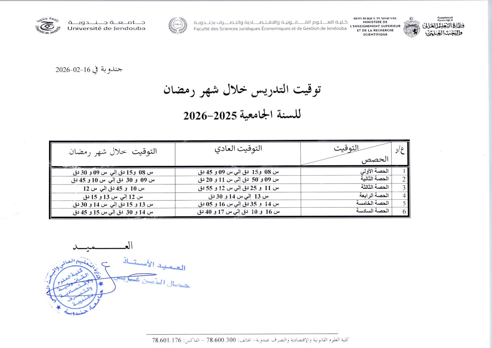 توقيت التدريس خلال شهر رمضان للسنة الجامعية 2025-2026