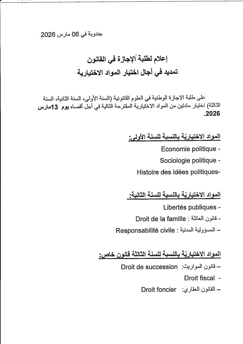 اعلام لطلبة الإجازة في القانون تمديد في اجال اختيار المواد الإختيارية