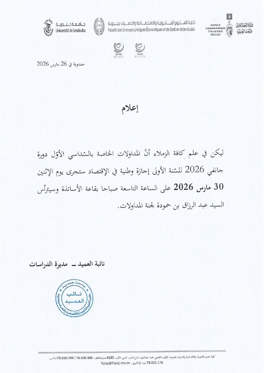 اعلام حول المدولات الخاصة بالسداسي الأول دورة جانفي 2026لسنة أولى اجازة وطنية في الإقتصاد