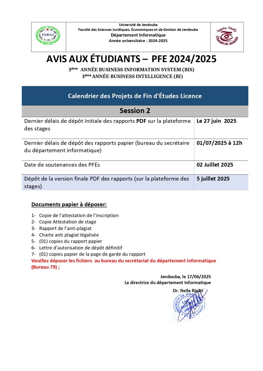 AVIS AUX ÉTUDIANTS – PFE 2024/2025 3 éme ANNÉE BUSINESS INFORMATION SYSTEM (BIS) 3 éme ANNÉE BUSINESS INTELLIGENCE (BI)
