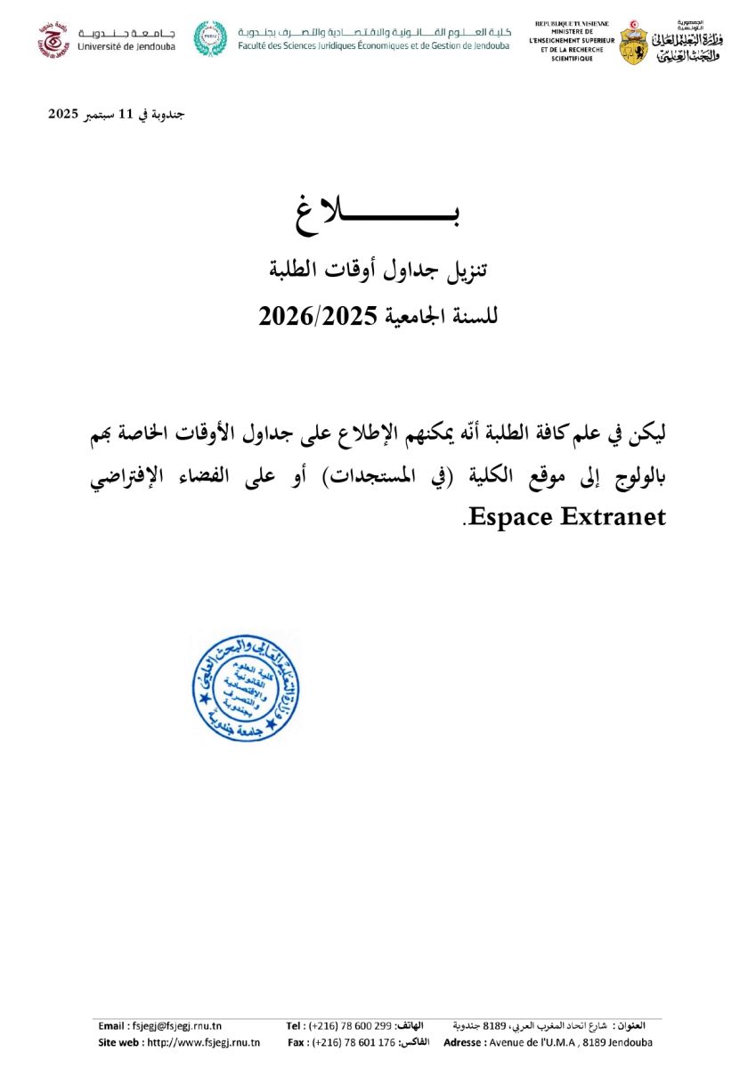 بـــلاغ تنزيل جداول أوقات الطلبة للسنة الجامعية 2026/2025