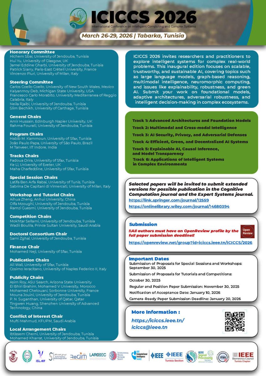 We are delighted to invite you to contribute to the IEEE International Conference on Intelligent Computing and Complex Systems (ICICCS 2026), which will be held in Tabarka, Tunisia, on March 26–29, 2026.