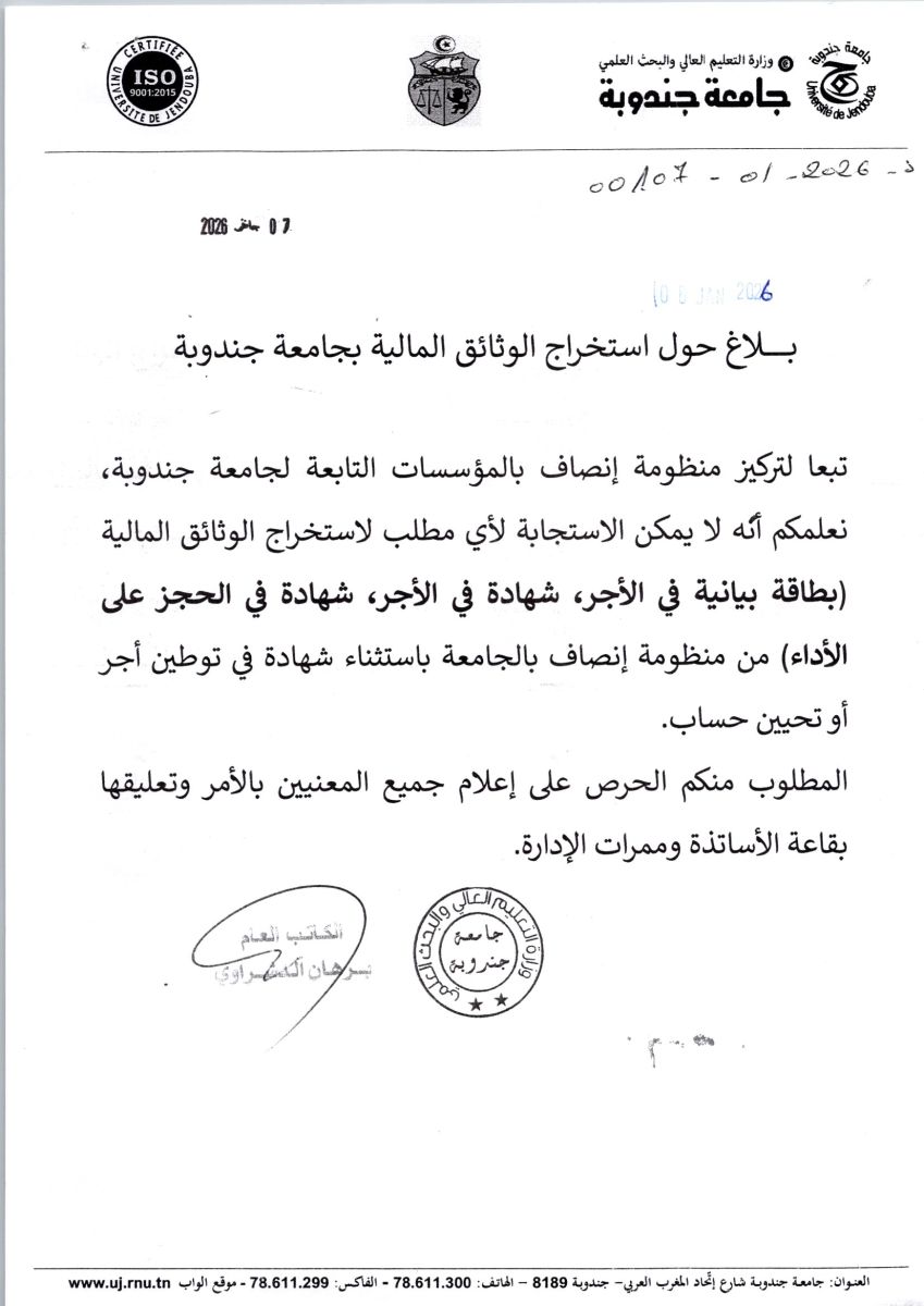 بلاغ حول استخراج الوثائق المالية بجامعة جندوبة